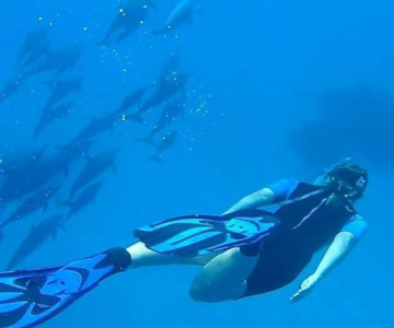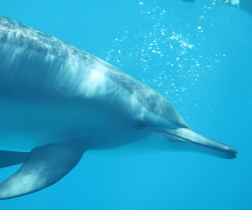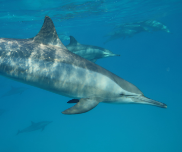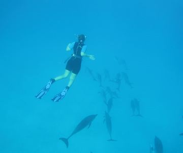 Quand les dauphins sont dans la baie, nous vous inviterons avec les maîtres nageurs du bateau à les rejoindre (de 2 à 3 fois par jour – avec les zodiacs si nécessaire). Les dauphins sont heureux de nager avec nous, plusieurs d'entre eux ayant l'habitude de côtoyer les humains depuis de nombreuses années. Les dauphins sont des créatures curieuses et ils aiment s'approcher de nous, lancer des regards pénétrants à travers nos masques et nager avec nous côte à côte. Ils nous inviteront à nager près d'eux en avançant tout doucement pour que nous puissions les suivre. Ils pourraient sauter et jouer et se pourchasser l'un l' autre, nous invitant parfois à en faire autant et nous offrant un spectacle dont nous nous souviendrons pour toujours. Ils aiment tout particulièrement les enfants et sont très doux et gentils dans leur approche.